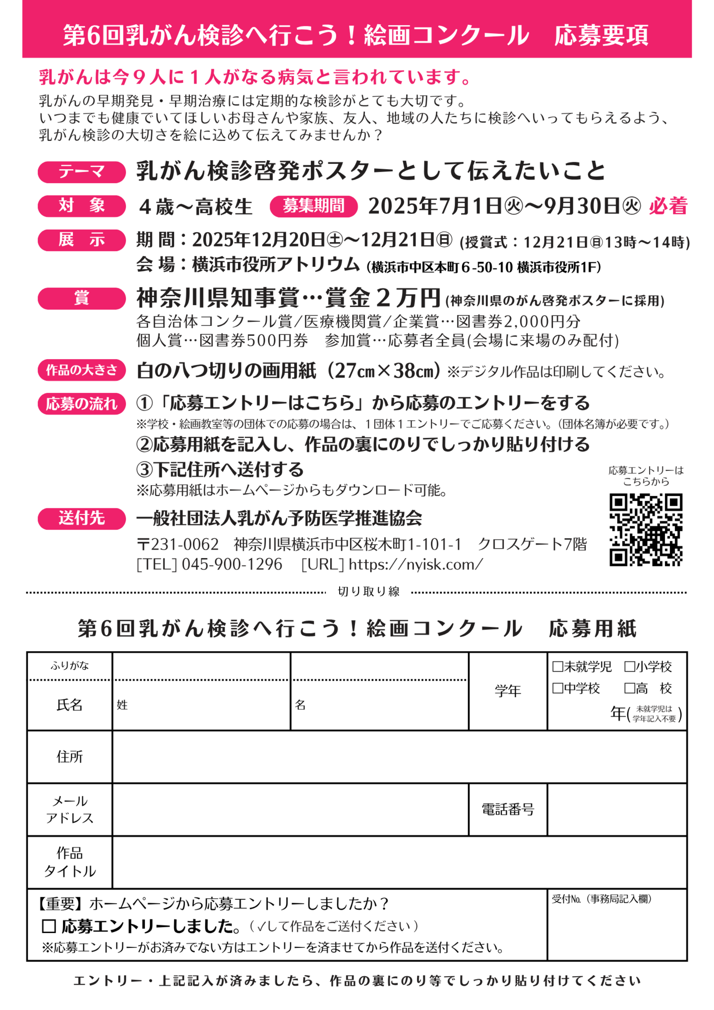 - 応募用紙にご記入いただいた個人情報は弊団体のプライバシーに準じて、絵画コンクールにおける発表・通知・発送・次回案内などの関連業務において使用させていただき、法令等により開示を求められた場合を除き、本人の同意なく関係者以外の第三者に開示・提供されることはありません。