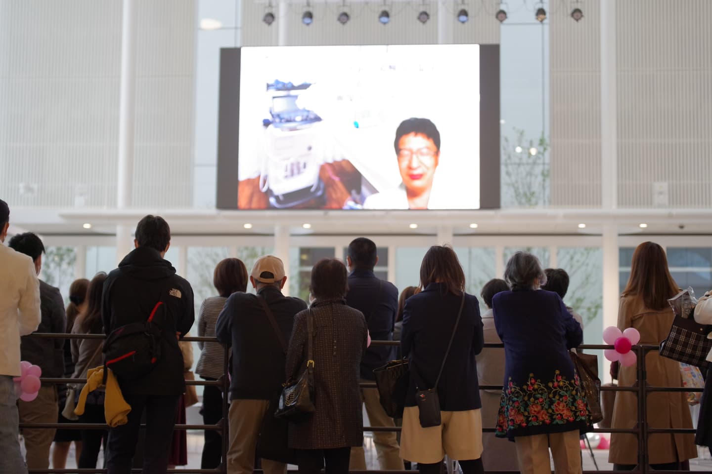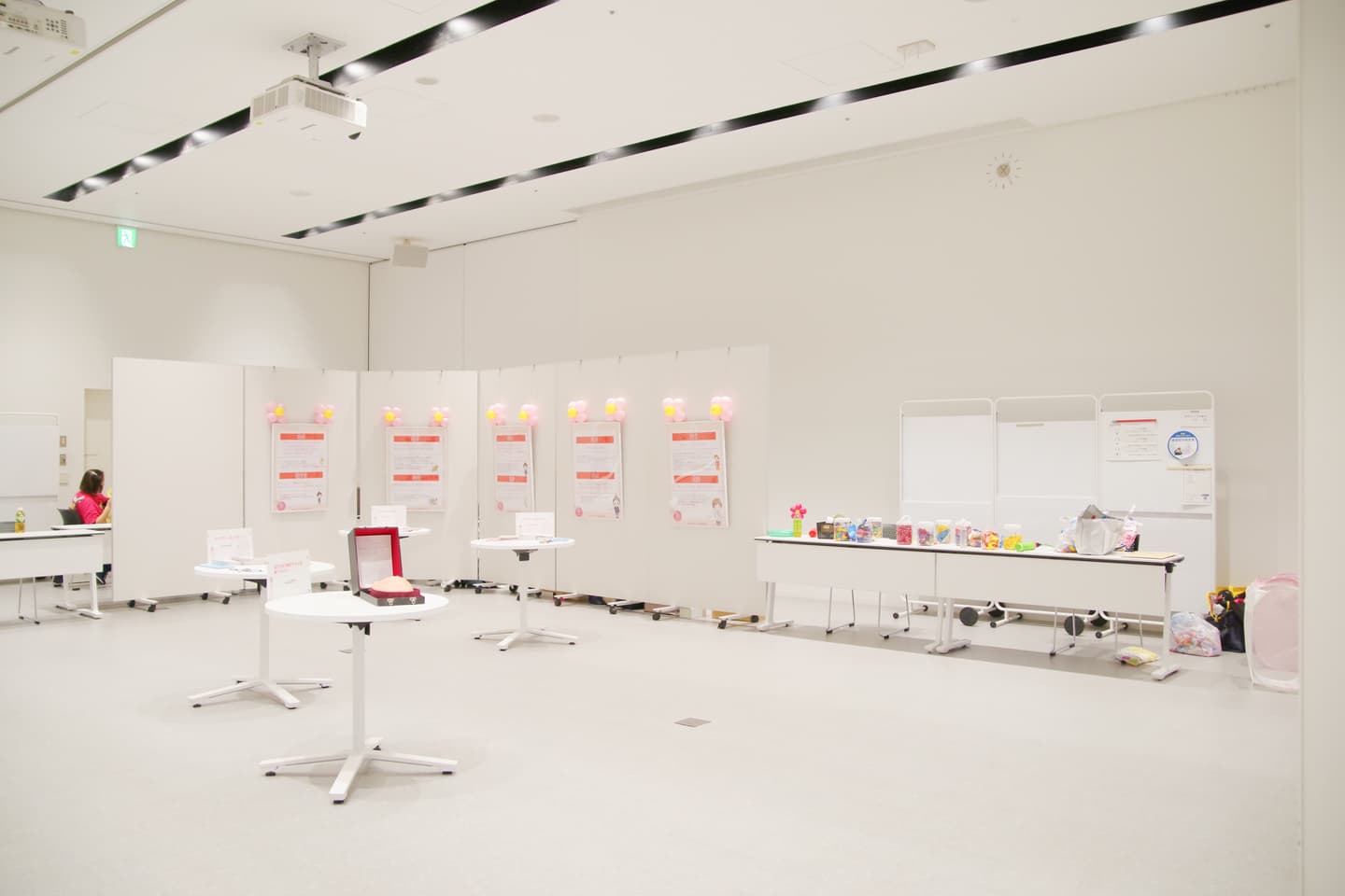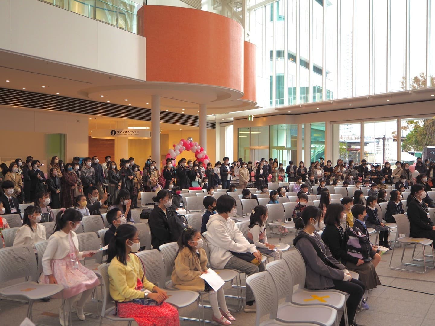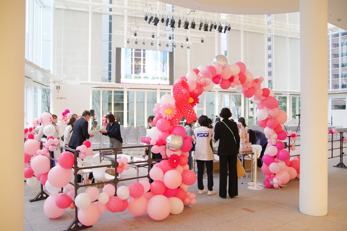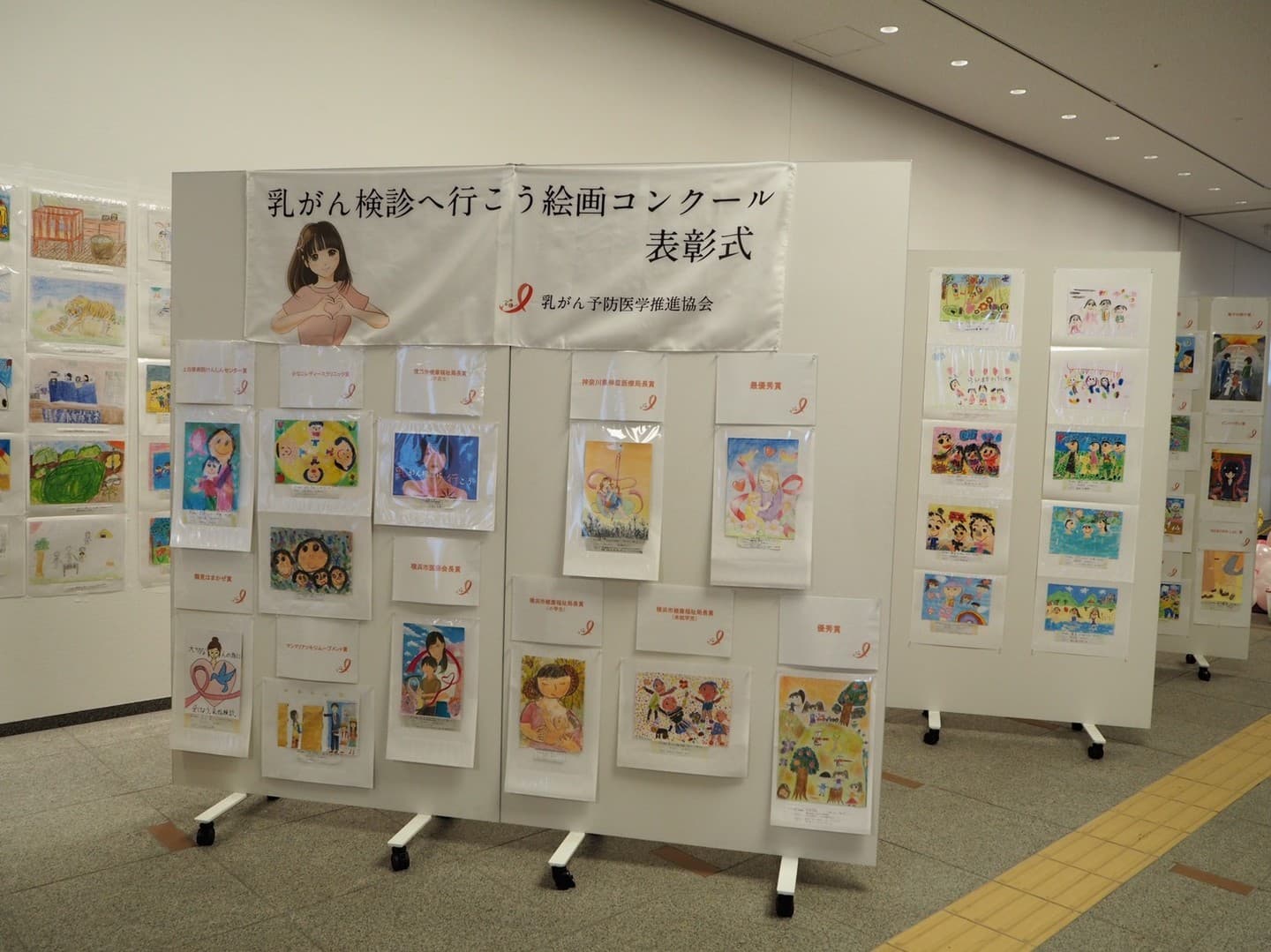 受賞者117名の内81名の子どもたちが駆けつけてくれました。会場は300名程の方々にお越しいただき、また展示場全体を風船で飾っていただいたりと、とても華やかでした。宣言が解除されたばかりのタイミングでもあり、久々に多くの人が集まった催しになったように感じます。今回は絵画展示ブース、学習ブース、式場ブースの3エリアに分けました。絵画ブースでは246名全員の絵画を飾り、学習ブースでは子ども達のQ&Aポスターやマンモグラフィの実際の画像、乳がんの触診モデルを置いて誰でもが触れられるように展示しました。エコーの機器をこんにゃくにあてるとどうなるか?の体験ブースを展開していただいたり、Q&Aのポスターからクイズラリーを行ったりして、子どもたちの関心を集めました。今回は小学生の子ども達からも「ピンクリボン」や「検診に行こう!」をテーマにした絵画も多数送られてきて、とても考えさせられる作品が多かったです。