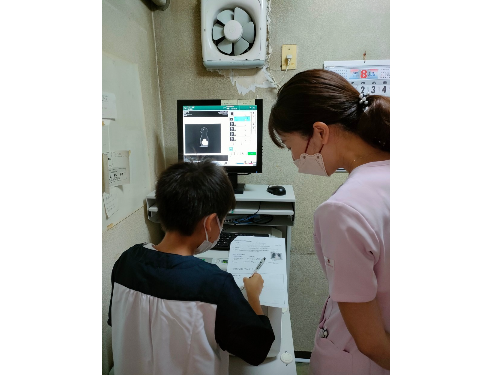 港南区の診療所にて、検診会と同時に子ども職業体験会を開催しました!(写真はレントゲンで貯金箱を撮影!)