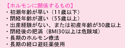 | 乳がん発症は、女性ホルモンであるエストロゲン(主に卵巣から分泌)が関係しているといわれています。エストロゲンが分泌されている期間が長ければ長いほど乳がんを発症するリスクは高まります。月経が早く始まった人、閉経が遅い人、出産したことのない人、授乳期間が短い人、ホルモン補充療法を行なっている人は乳がんのリスクが高いとされています。 |