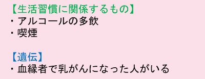 乳がんになりやすい要因は様々です。しかし、下記に該当するからといって、必ずしも乳がんになるというわけではありません。