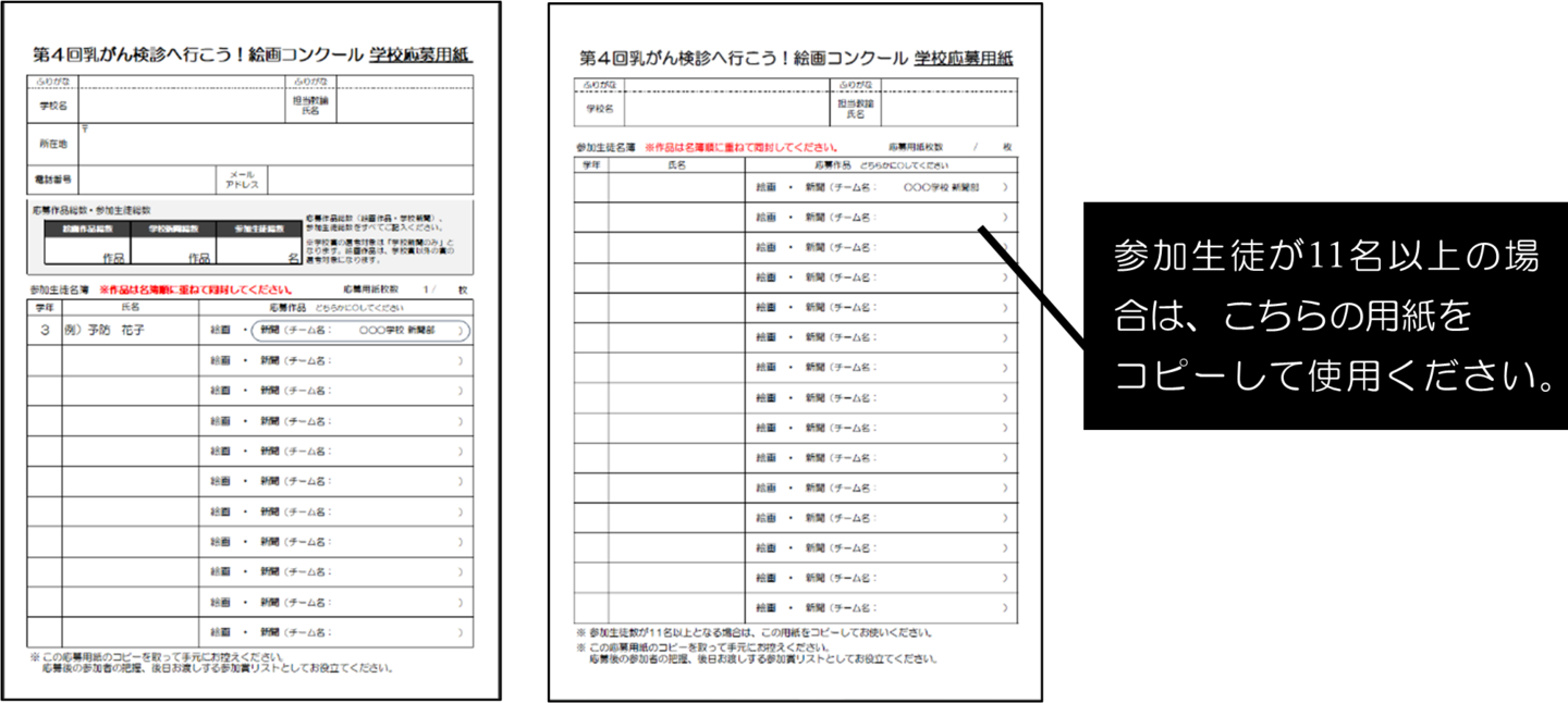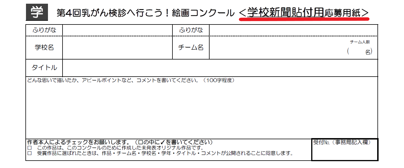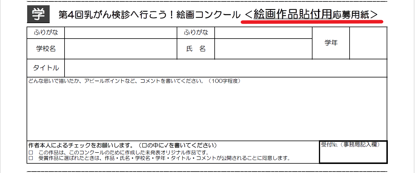 - 作品貼付用応募用紙は「絵画作品用」「学校新聞用」の2種類ありますのでお間違いのないようご注意ください。